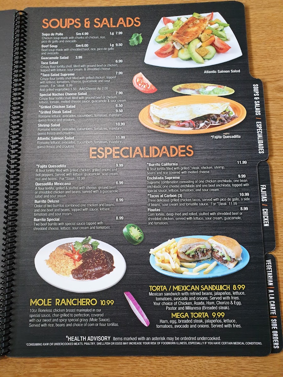 You’ll find a variety of savory options like the El Molcajete Special, hearty fajitas, and tender carnitas tacos, ideal for lunch or dinner. The menu also includes lighter choices such as fresh salads and vegetarian plates with rice and beans, catering to different tastes and appetites.